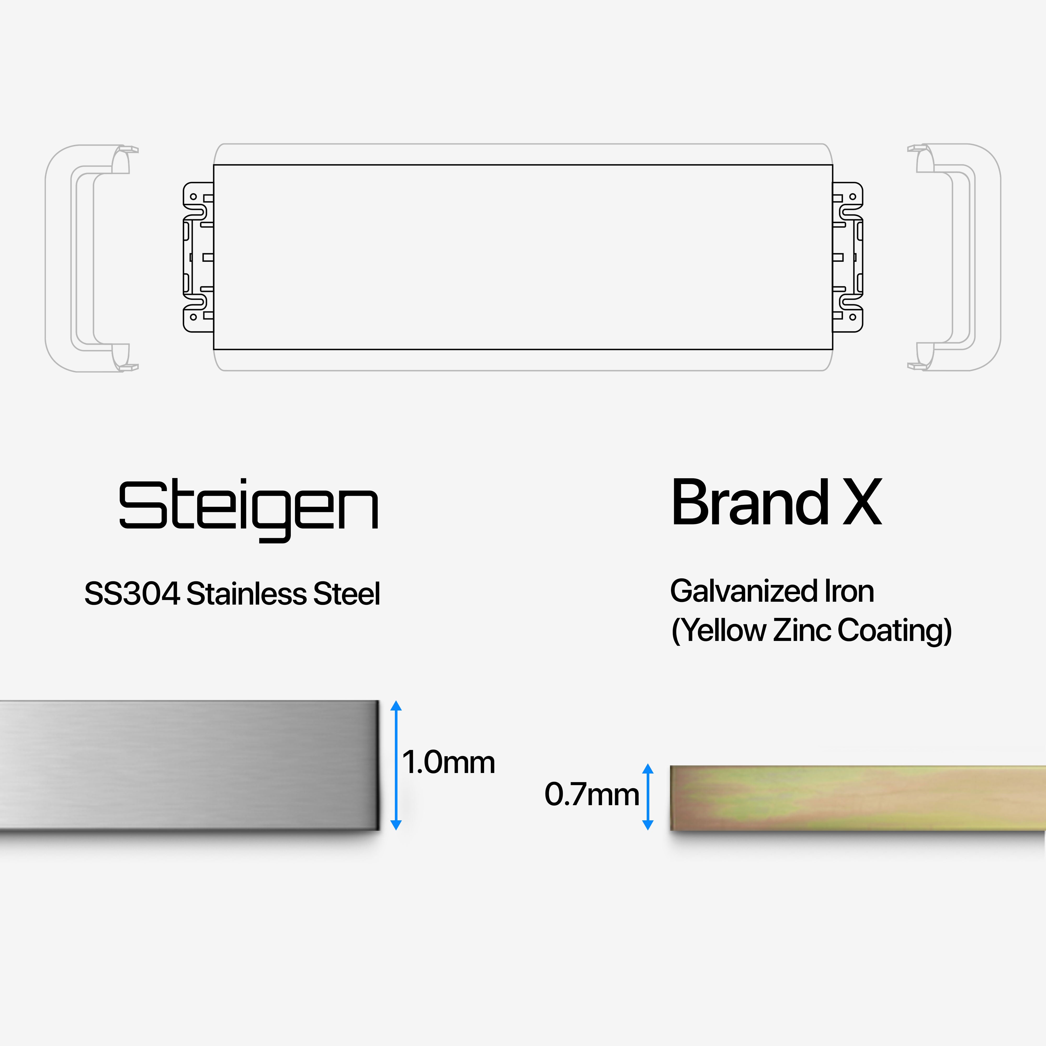 An innovative mounting body frame made with SS304 stainless steel that has high-temperature resistance, high corrosion resistance and high tensile strength (resistance to breakage). The 1.0mm thick body frame is engineered to withstand vigorous mechanical movements and prevent warping over long-term use.