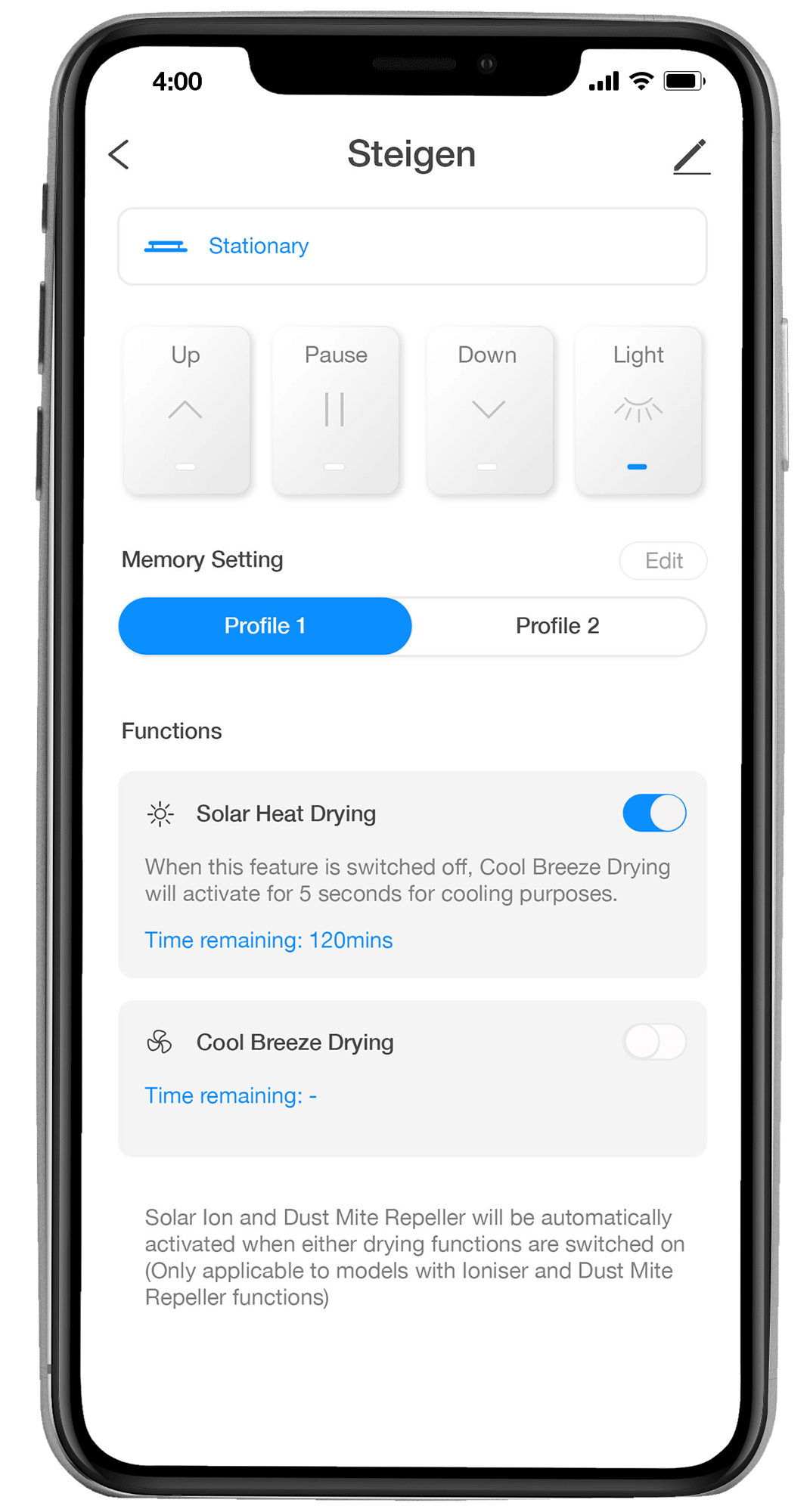 Control various Steigen functions using your voice (Solar Heat Drying, Dust Mite Repeller, lighting and more!). Plus, multiple voice control languages supported.